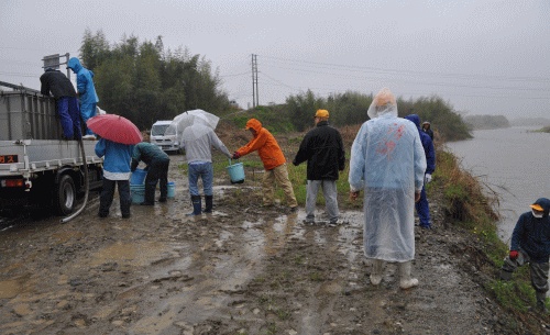 令和7年4年18日 宇賀渓の河川敷に於いて「あまご体験放流会」を開催しました。